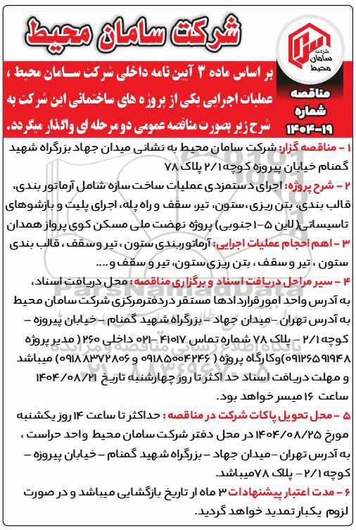 بر اساس ماده 3 آیین نامه داخلی شرکت سامان محیط، عملیات اجرایی یکی از پروژه های ساختمانی این شرکت به شرح زیر بصورت مناقصه عمومی دو مرحله ای واگذار میگردد.