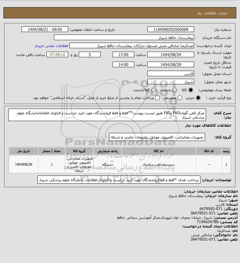 تلفن:5- 88349670 (021) فکس: 88349673 (021) Website: www.ParsNamadData.com E-mail: Info@ParsNamadData.com استعلام مرکز تلفن گویانFXO وFXS طبق لیست پیوست**فقط و فقط فروشندگان مورد تایید حراست و فناوری اطلاعاتدانشگاه علوم پزشکی شیراز