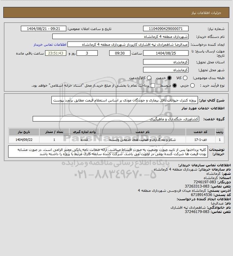 تلفن:5- 88349670 (021) فکس: 88349673 (021) Website: www.ParsNamadData.com E-mail: Info@ParsNamadData.com استعلام پروژه کنترل حیوانات ناقل بیماری و جوندگان موذی بر اساس استعلام قیمت مطابق برآورد پیوست