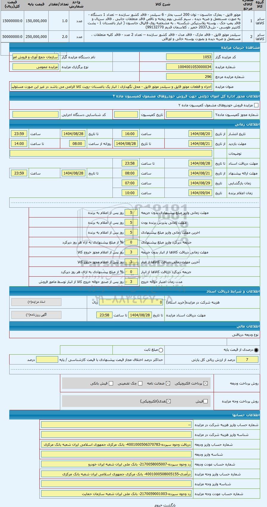 تلفن:5- 88349670 (021) فکس: 88349673 (021) Website: www.ParsNamadData.com E-mail: Info@ParsNamadData.com مزایده اجزاء و قطعات موتور قایق و سیلندر موتور قایق - محل نگهداری : انبار یک باغستان -رویت کالا الزامی می باشد در غیر این صورت
