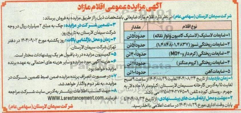 شرکت سیمان لارستان (سهامی عام) در نظر دارد اقلام مازاد ضایعاتی با مشخصات ذیل را از طریق مزایده به فروش برساند: