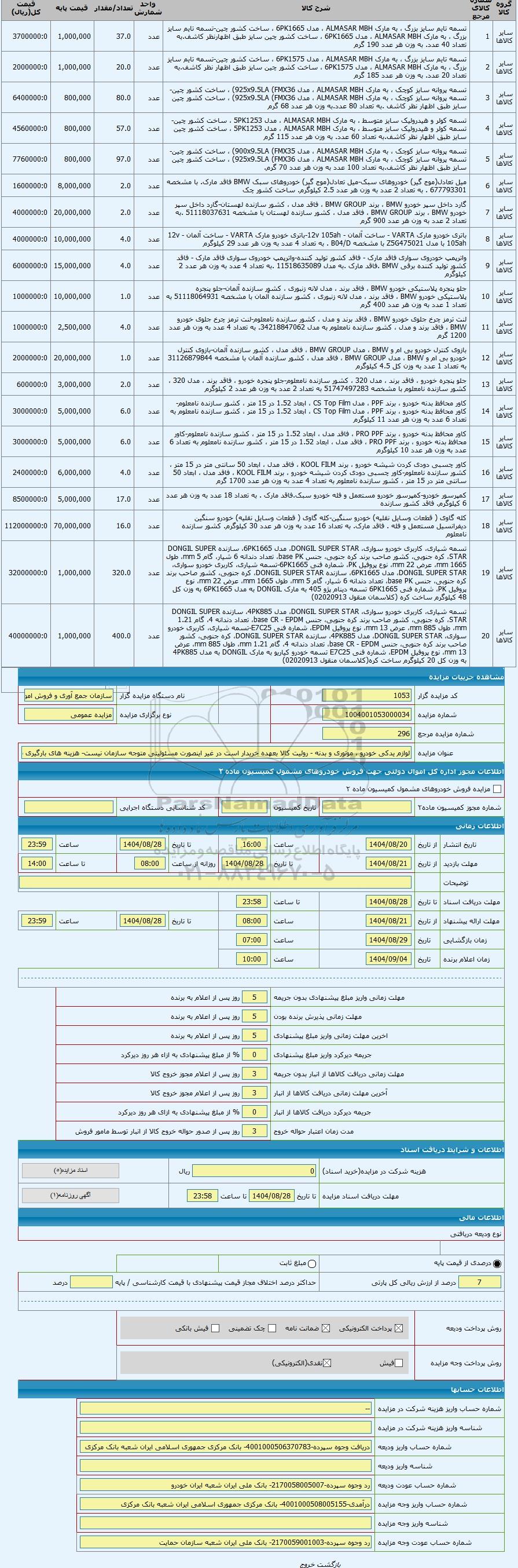 | سایر کالاها | 1 | تسمه تایم سایز بزرگ ، به مارک ALMASAR MBH ، مدل 6PK1665 ، ساخت کشور چین-تسمه تایم سایز بزرگ ، به مارک ALMASAR MBH ، مدل 6PK1665 ، ساخت کشور چین سایز طبق اظهارنظر کاشف.به تعداد 40 عدد. به وزن هر عدد 190 گرم | عدد | 37.0 | 1,000,000 | 3700000:0 | | سایر کالاها | 2 | تسمه تایم سایز بزرگ ، به مارک ALMASAR MBH ، مدل 6PK1575 ، ساخت کشور چین-تسمه تایم سایز بزرگ ، به مارک ALMASAR MBH ، مدل 6PK1575 ، ساخت کشور چین سایز طبق اظهار نظر کاشف.به تعداد 20 عدد. به وزن هر عدد 185 گرم | عدد | 20.0 | 1,000,000 | 2000000:0 | | سایر کالاها | 3 | تسمه پروانه سایز کوچک ، به مارک ALMASAR MBH ، مدل 925x9.5LA (FMX36) ، ساخت کشور چین-تسمه پروانه سایز کوچک ، به مارک ALMASAR MBH ، مدل 925x9.5LA (FMX36) ، ساخت کشور چین سایز طبق اظهار نظر کاشف .به تعداد 80 عدد.به وزن هر عدد 68 گرم | عدد | 80.0 | 800,000 | 6400000:0 | | سایر کالاها | 4 | تسمه کولر و هیدرولیک سایز متوسط ، به مارک ALMASAR MBH ، مدل 5PK1253 ، ساخت کشور چین-تسمه کولر و هیدرولیک سایز متوسط ، به مارک ALMASAR MBH ، مدل 5PK1253 ، ساخت کشور چین سایز طبق اظهار نظر کاشف.به تعداد 60 عدد. به وزن هر عدد 115 گرم | عدد | 57.0 | 800,000 | 4560000:0 | | سایر کالاها | 5 | تسمه پروانه سایز کوچک ، به مارک ALMASAR MBH ، مدل 900x9.5LA (FMX35) ، ساخت کشور چین-تسمه پروانه سایز کوچک ، به مارک ALMASAR MBH ، مدل 925x9.5LA (FMX36) ، ساخت کشور چین سایز طبق اظهار نظر کاشف.به تعداد 100 عدد به وزن هر عدد 70 گرم. | عدد | 97.0 | 800,000 | 7760000:0 | | سایر کالاها | 6 | میل تعادل(موج گیر) خودروهای سبک-میل تعادل(موج گیر) خودروهای سبک BMW فاقد مارک. با مشخصه 677793301 . به تعداد 2 عدد به وزن هر عدد 2.5 کیلوگرم. ساخت کشور چک | عدد | 2.0 | 8,000,000 | 1600000:0 | | سایر کالاها | 7 | گارد داخل سپر خودرو BMW ، برند BMW GROUP ، فاقد مدل ، کشور سازنده لهستان-گارد داخل سپر خودرو BMW ، برند BMW GROUP ، فاقد مدل ، کشور سازنده لهستان با مشخصه 51118037631 .به تعداد 2 عدد به وزن هر عدد 900 گرم | عدد | 2.0 | 20,000,000 | 4000000:0 | | سایر کالاها | 8 | باتری خودرو مارک VARTA - ساخت آلمان - 12v 105ah-باتری خودرو مارک VARTA - ساخت آلمان - 12v 105ah با مدل Z5G475021 با مشخصه B04/D . به تعداد 4 عدد به وزن هر عدد 29 کیلوگرم | عدد | 4.0 | 10,000,000 | 4000000:0 | | سایر کالاها | 9 | واترپمپ خودروی سواری فاقد مارک - فاقد کشور تولید کننده-واترپمپ خودروی سواری فاقد مارک - فاقد کشور تولید کننده برقی BMW .فاقد مارک .به مدل 11518635089 .به تعداد 4 عدد به وزن هر عدد 2 کیلوگرم | عدد | 4.0 | 15,000,000 | 6000000:0 | | سایر کالاها | 10 | جلو پنجره پلاستیکی خودرو BMW ، فاقد برند ، مدل لانه زنبوری ، کشور سازنده آلمان-جلو پنجره پلاستیکی خودرو BMW ، فاقد برند ، مدل لانه زنبوری ، کشور سازنده آلمان با مشخصه 51118064931 به تعداد 1 عدد به وزن هر عدد 400 گرم | عدد | 1.0 | 10,000,000 | 1000000:0 | | سایر کالاها | 11 | لنت ترمز چرخ جلوی خودرو BMW ، فاقد برند و مدل ، کشور سازنده نامعلوم-لنت ترمز چرخ جلوی خودرو BMW ، فاقد برند و مدل ، کشور سازنده نامعلوم به مدل 34218847062. به تعداد 4 عدد به وزن هر عدد 1200 گرم | عدد | 4.0 | 2,500,000 | 1000000:0 | | سایر کالاها | 12 | بازوی کنترل خودرو بی ام و BMW ، مدل BMW GROUP ، فاقد مدل ، کشور سازنده آلمان-بازوی کنترل خودرو بی ام و BMW ، مدل BMW GROUP ، فاقد مدل ، کشور سازنده آلمان با مشخصه 31126879844 به تعداد 1 عدد به وزن کل 4.5 کیلوگرم | عدد | 1.0 | 20,000,000 | 2000000:0 | | سایر کالاها | 13 | جلو پنجره خودرو ، فاقد برند ، مدل 320 ، کشور سازنده نامعلوم-جلو پنجره خودرو ، فاقد برند ، مدل 320 ، کشور سازنده نامعلوم با مشخصه 51747497283 به تعداد 2 عدد به وزن هر عدد 2 کیلوگرم | عدد | 2.0 | 3,000,000 | 600000:0 | | سایر کالاها | 14 | کاور محافظ بدنه خودرو ، برند PPF ، مدل CS Top Film ، ابعاد 1.52 در 15 متر ، کشور سازنده نامعلوم-کاور محافظ بدنه خودرو ، برند PPF ، مدل CS Top Film ، ابعاد 1.52 در 15 متر ، کشور سازنده نامعلوم به تعداد 6 عدد به وزن هر عدد 11 کیلوگرم | عدد | 6.0 | 5,000,000 | 3000000:0 | | سایر کالاها | 15 | کاور محافظ بدنه خودرو ، برند PRO PPF ، فاقد مدل ، ابعاد 1.52 در 15 متر ، کشور سازنده نامعلوم-کاور محافظ بدنه خودرو ، برند PRO PPF ، فاقد مدل ، ابعاد 1.52 در 15 متر ، کشور سازنده نامعلوم به تعداد 6 عدد به وزن هر عدد 10 کیلوگرم 