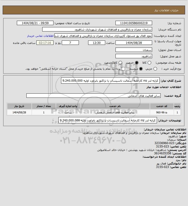 تلفن:5- 88349670 (021) فکس: 88349673 (021) Website: www.ParsNamadData.com E-mail: Info@ParsNamadData.com استعلام کرایه لدر mz کارخانه آسفالت تاسیسات یا تراکتور بابراورد اولیه 9.240.000.000