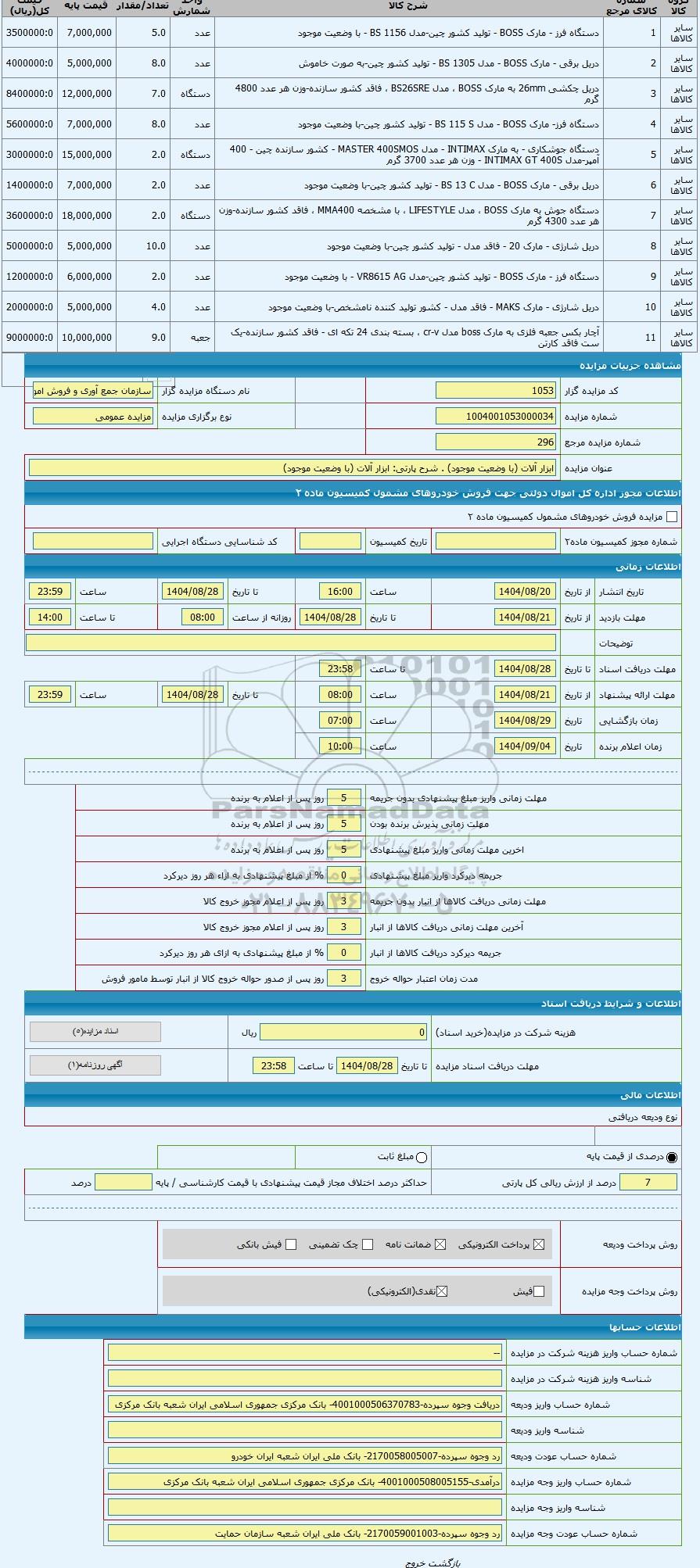 | | شماره مزایده مرجع | 296 | | | | | عنوان مزایده | ابزار آلات (با وضعیت موجود) |