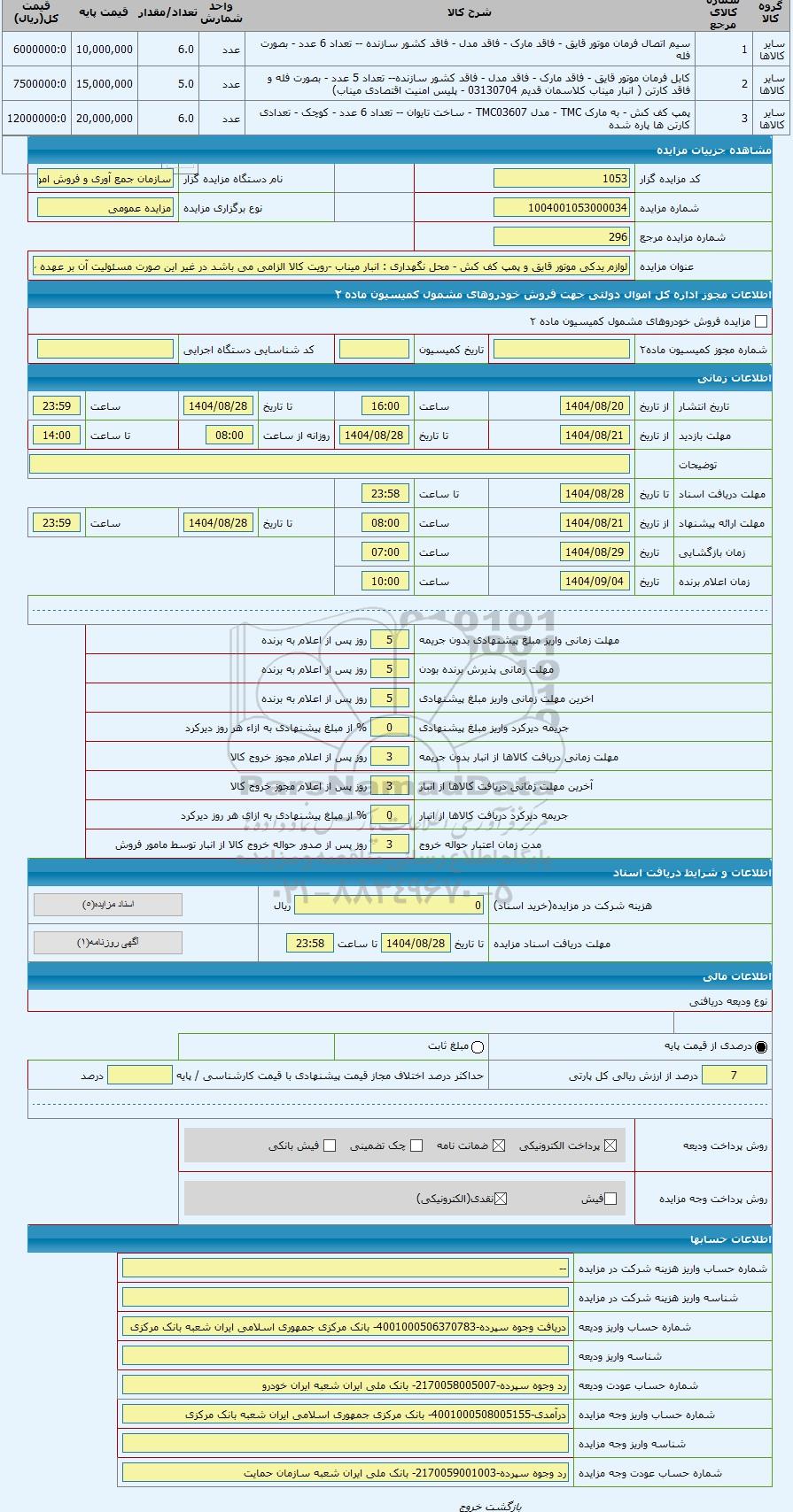 | عنوان آگهی: مزایده لوازم یدکی موتور قایق و پمپ کف کش - محل نگهداری : انبار میناب -رویت کالا الزامی می باشد در غیر این صورت مسئولیت آن بر ع |