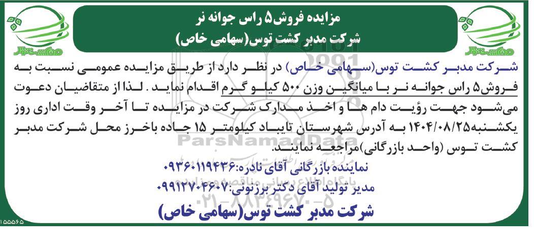 تلفن:5- 88349670 (021) فکس: 88349673 (021) Website: www.ParsNamadData.com E-mail: Info@ParsNamadData.com مزایده فروش 5 راس جوانه نر با میانگین وزن 500 کیلوگرم