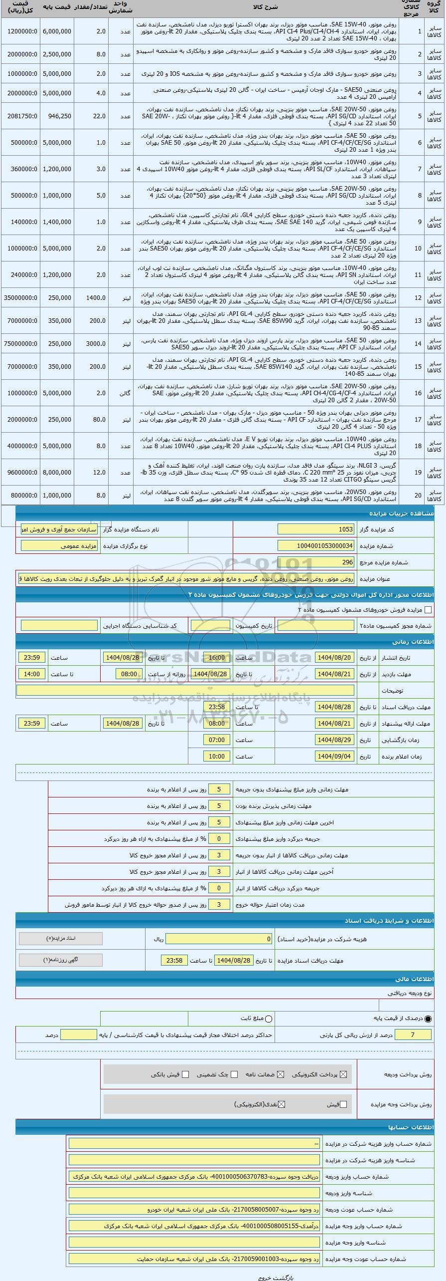 | | شماره مزایده مرجع | 296 | | | | | عنوان مزایده | روغن موتور، روغن صنعتی، روغن دنده، گریس و مایع موتور شور موجود در انبار گمرک تبریز و به دلیل جلوگیری از تبعات بعدی رویت کالاها قبل از ارائه پیشنهاد الزامی است. |