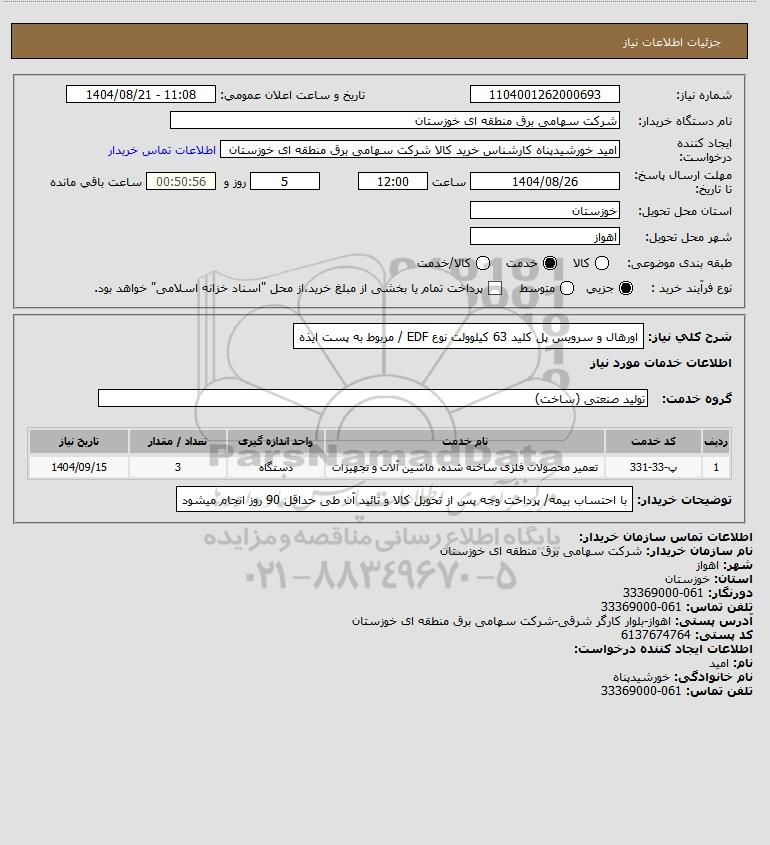 تلفن:5- 88349670 (021) فکس: 88349673 (021) Website: www.ParsNamadData.com E-mail: Info@ParsNamadData.com استعلام اورهال و سرویس پل کلید 63 کیلوولت نوع EDF / مربوط به پست ایذه