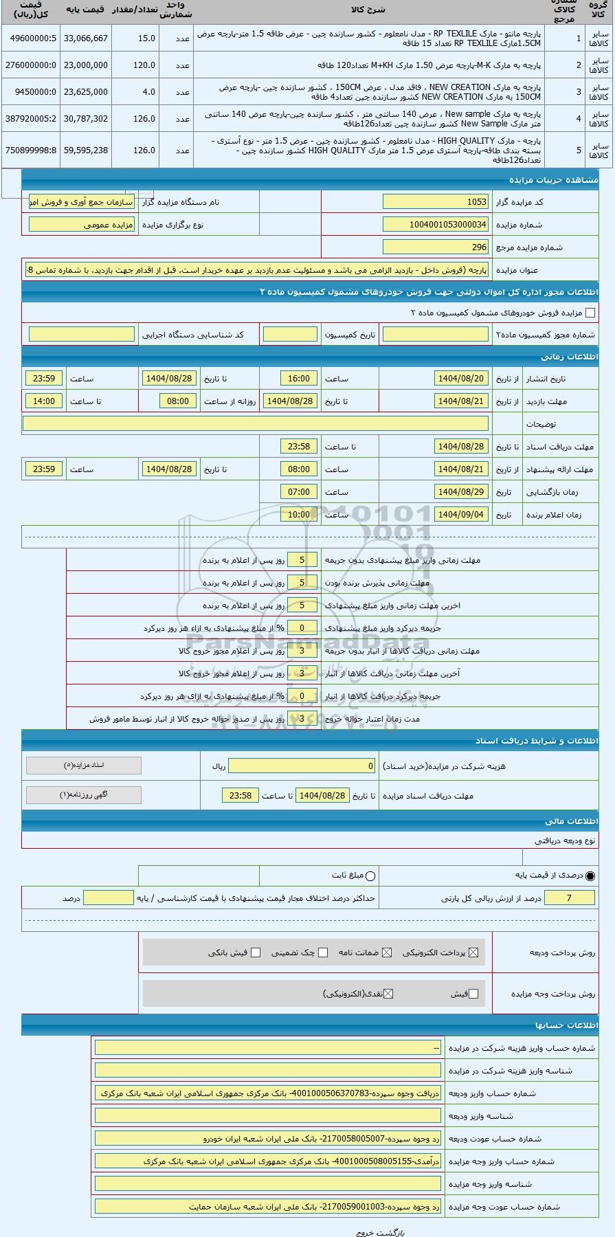 مزایده پارچه (فروش داخل - بازدید الزامی می باشد و مسئولیت عدم بازدید بر عهده خریدار است. قبل از اقدام جهت بازدید با شماره تما