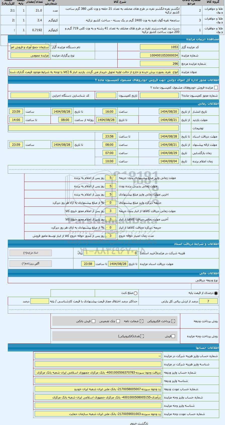 تلفن:5- 88349670 (021) فکس: 88349673 (021) Website: www.ParsNamadData.com E-mail: Info@ParsNamadData.com مزایده انواع نقره. بصورت برش خرده و خارج از حالت اولیه تحویل خریدار می گردد. بازدید انبار 6 (کالا با توجه به شرایط موجود قیمت