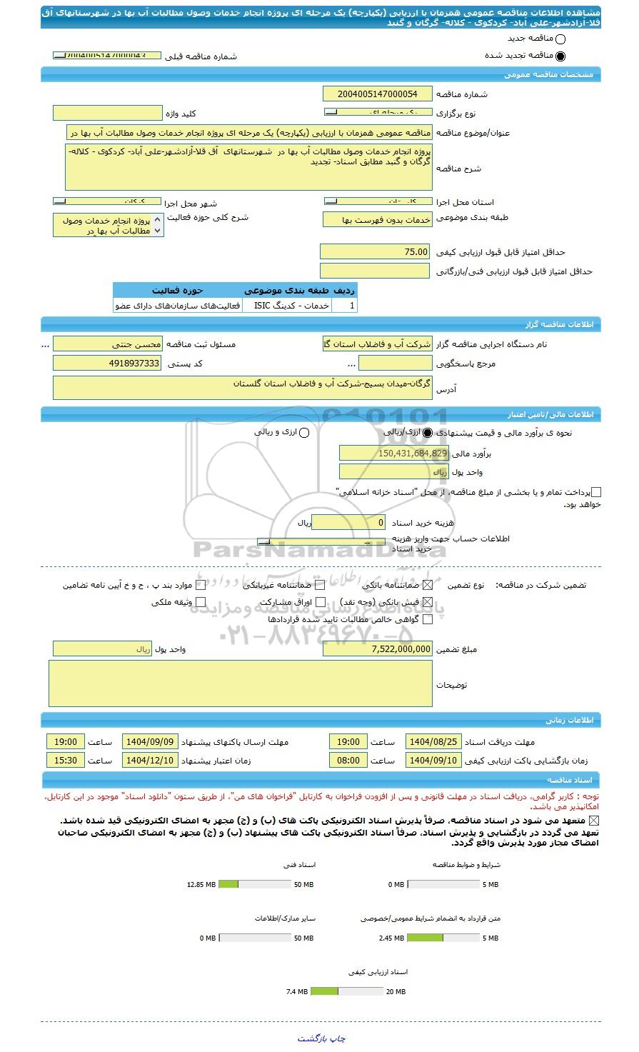 | عنوان آگهی: مناقصه مناقصه عمومی همزمان با ارزیابی (یکپارچه) یک مرحله ای پروژه انجام خدمات وصول مطالبات آب بها در شهرستانهای آق قلا-آزادشهر-علی آباد- کردکوی - کلاله- گرگان و گنبد |