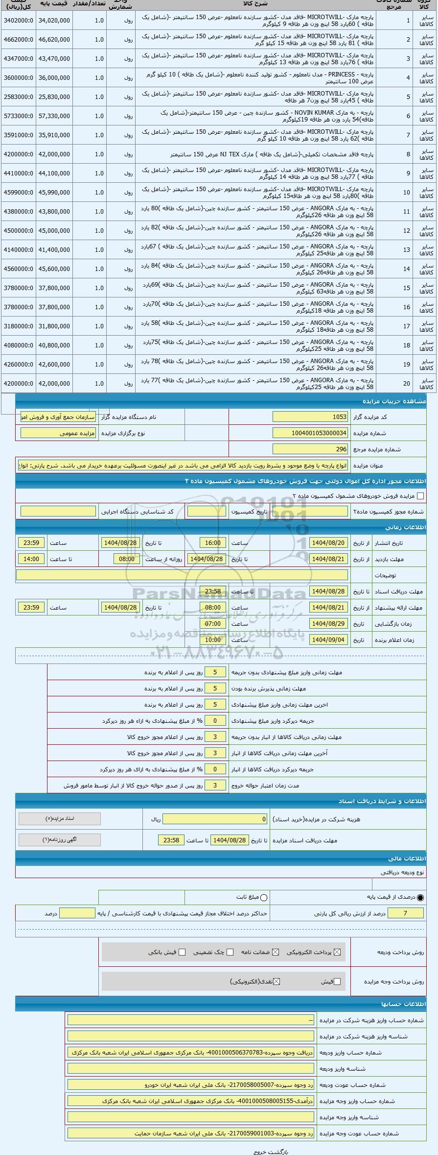| عنوان آگهی: مزایده انواع پارچه با وضع موجود و بشرط رویت بازدید کالا الزامی می باشد در غیر اینصورت مسوئلیت برعهده خریدار می باشد |