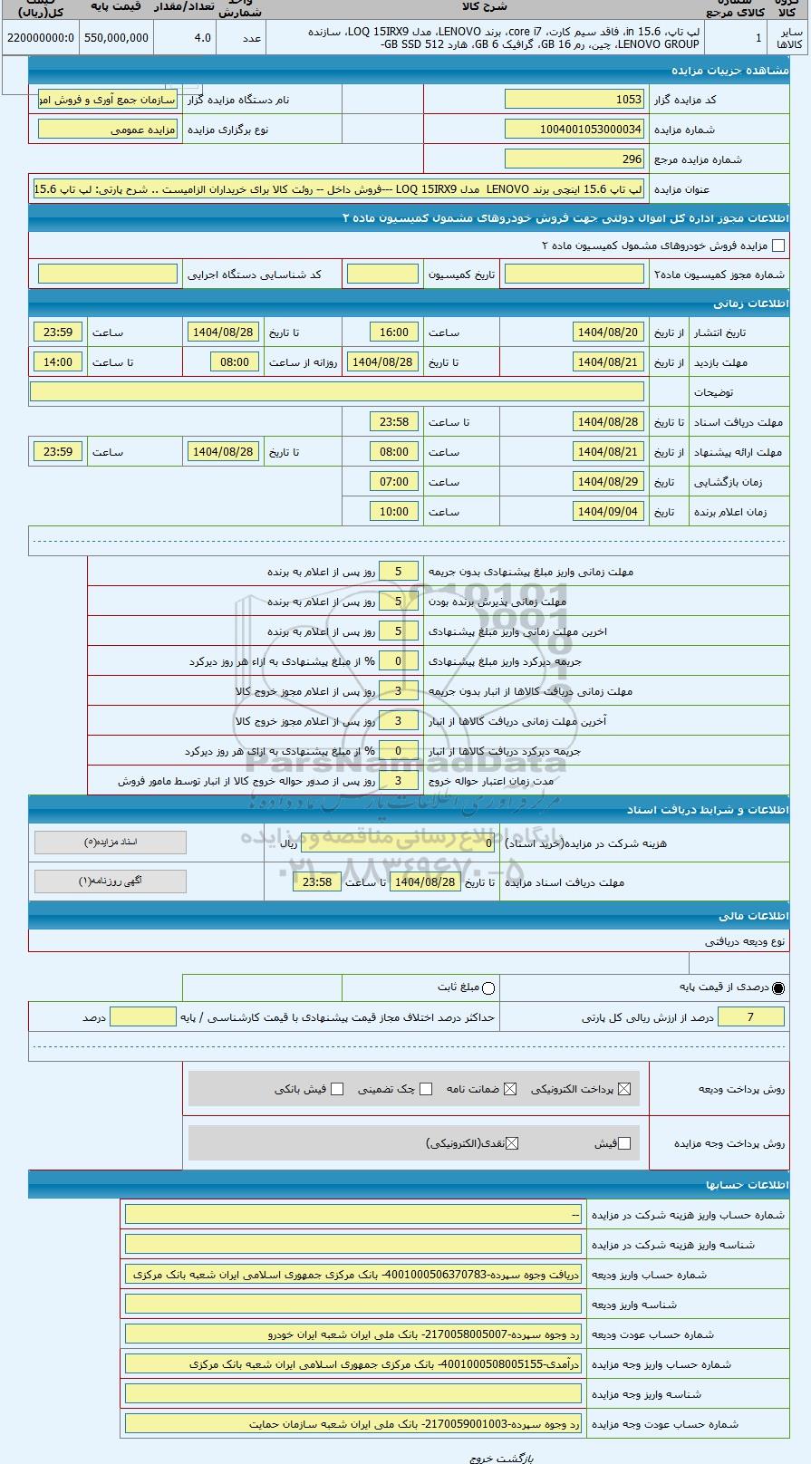 تلفن:5- 88349670 (021) فکس: 88349673 (021) Website: www.ParsNamadData.com E-mail: Info@ParsNamadData.com مزایده لپ تاپ 15.6 اینچی برند LENOVO مدل LOQ 15IRX9 ---فروش داخل -- روئت کالا برای خریداران الزامیست .