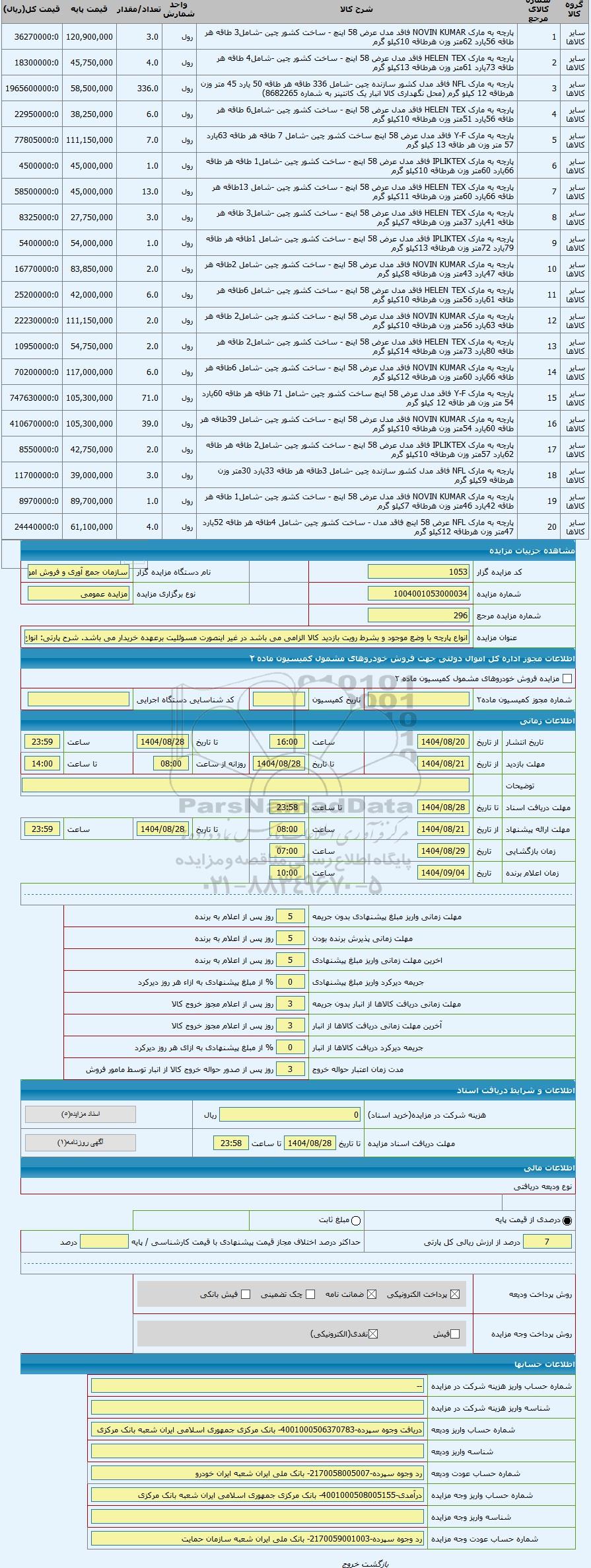 | عنوان آگهی: مزایده انواع پارچه با وضع موجود و بشرط رویت بازدید کالا الزامی می باشد در غیر اینصورت مسوئلیت برعهده خریدار می باشد |