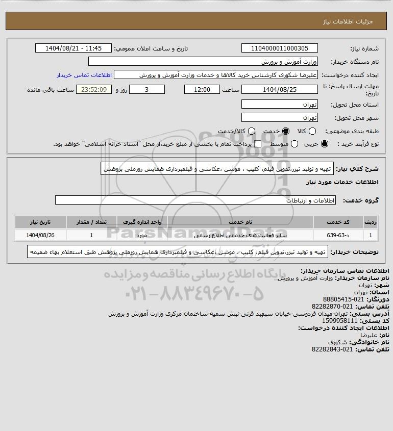 تلفن:5- 88349670 (021) فکس: 88349673 (021) Website: www.ParsNamadData.com E-mail: Info@ParsNamadData.com استعلام تهیه و تولید تیزرتدوین فیلم کلیپ موشن عکاسی و فیلمبرداری همایش روزملی پژوهش