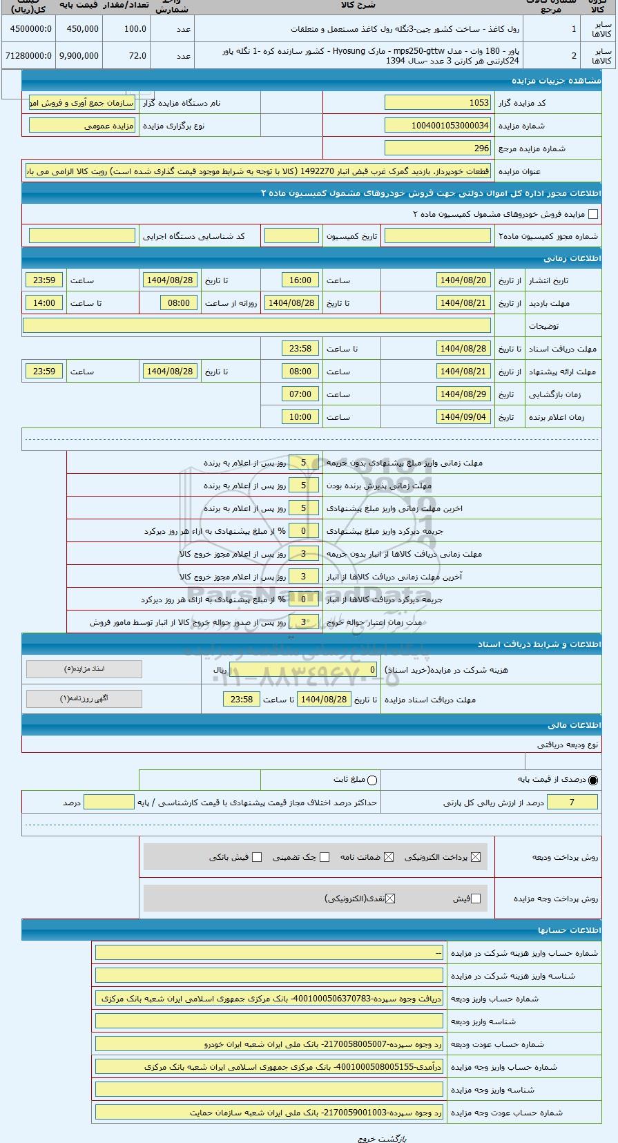 تلفن:5- 88349670 (021) فکس: 88349673 (021) Website: www.ParsNamadData.com E-mail: Info@ParsNamadData.com مزایده قطعات خودپرداز. بازدید گمرک غرب قبض انبار 1492270 (کالا با توجه به شرایط موجود قیمت گذاری شده است) رویت کالا الزامی می