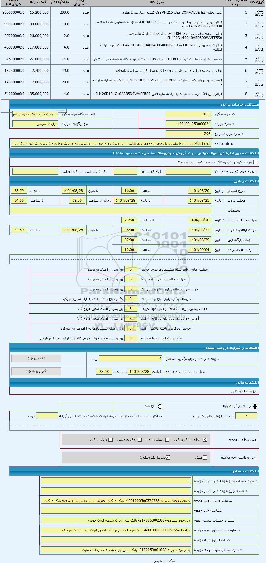 جزئیات آگهی| کد مزایده گزار | 1053 | | نام دستگاه مزایده گزار | سازمان جمع آوری و فروش اموال تملیکی | | شماره مزایده | 1004001053000034 | | | | | شماره پارتی | 1104001053013374 | | نوع برگزاری مزایده |