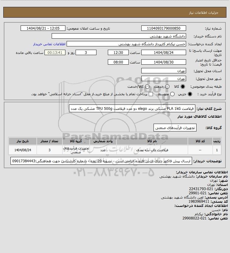 تلفن:5- 88349670 (021) فکس: 88349673 (021) Website: www.ParsNamadData.com E-mail: Info@ParsNamadData.com استعلام فیلامنت PLA 1kG مشکی برند elego دو عدد