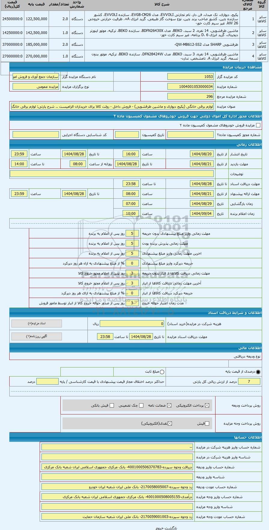 | | شماره مزایده مرجع | 296 | | | | | عنوان مزایده | لوازم برقی خانگی (پکیج دیواری و ماشین ظرفشویی) - فروش داخل - روئت کالا برای خریداران الزامیست . |