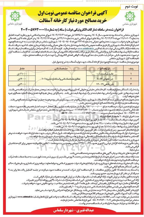 شهرداری سلماس به استناد بودجه مصوب سال 1404 و مصوبه 1874.15 ش مورخه 1403.12.26 شورای محترم اسلامی شهر و نظریه کمیته انطباق به شماره 16.15103 مورخه 1403.12.29 و بلا مانع شورای اسلامی شهر به شماره 22.15 ش مورخه 1404.12.17 و در اجرای ماده 4 آیین نامه مالی شهرداریها و درخواست سرپرست محترم امور عمرانی شهرداری سلماس در نظر دارد نسبت به خرید مصالح موردنیاز کارخانه آسفالت شهرداری را از طریق مناقصه عمومی با شرایط مشروحه ذیل از اشخاص واجد شرایط خریداری نماید. لذا جهت دریافت اسناد به سامانه تدارکات الکترونیکی دولت ستاد به آدرس ستاد ایران مراجعه فرمائید. لازم به ذکر است که کلیه مراحل برگزاری مناقصه از دریافت اسناد مناقصه تا ارائه پیشنهاد مناقصه گران و بازگشایی پاکتها و عقد قرارداد از طریق درگاه سامانه تدارکات الکترونیکی دولت (ستاد) انجام خواهد شد. لذا لازم است مناقصه گران در صورت عدم عضویت قبلی مراحل ثبت نام در سایت مذکور و دریافت گواهی امضای الکترونیکی را جهت شرکت در مناقصه محقق سازند.