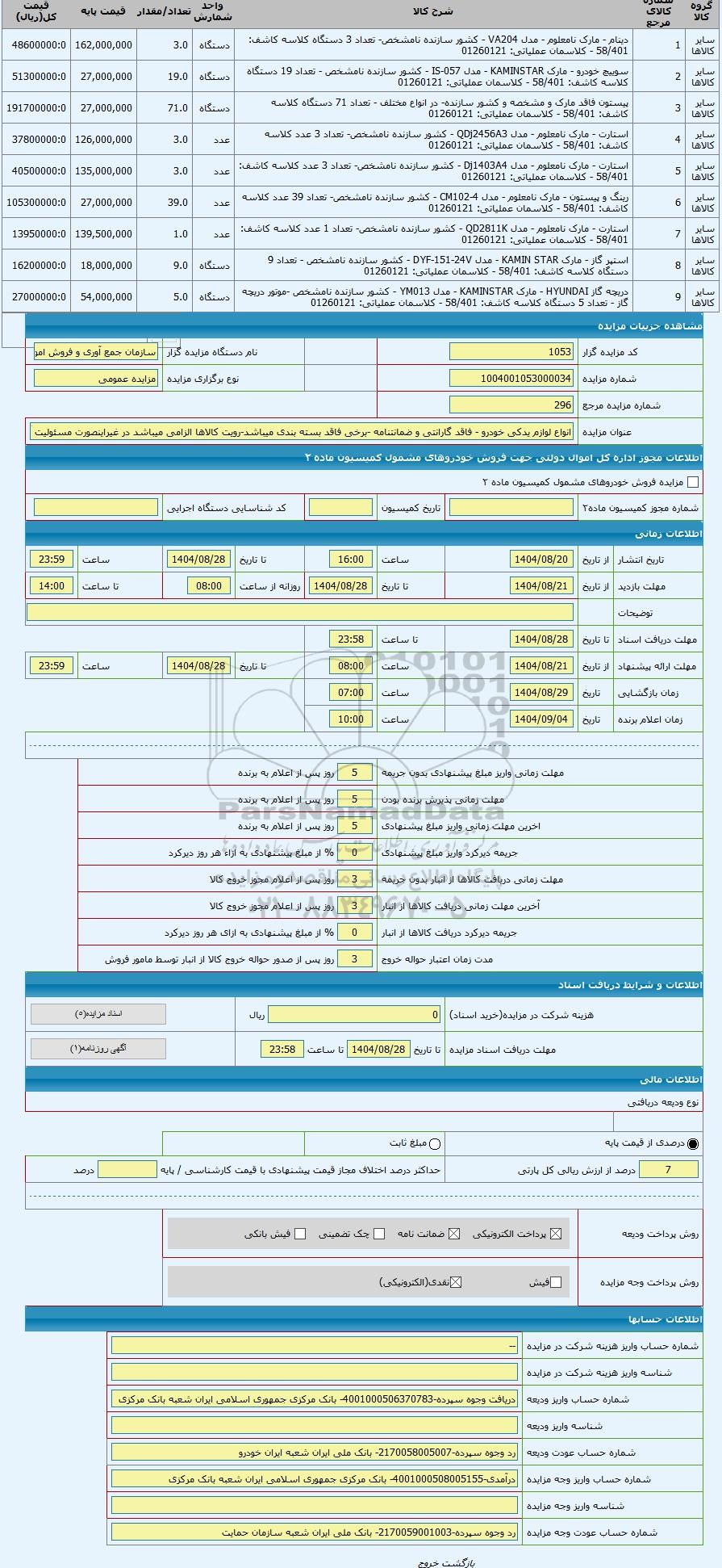 | عنوان آگهی: مزایده انواع لوازم یدکی خودرو - فاقد گارانتی و ضمانتنامه -برخی فاقد بسته بندی میباشد-رویت کالاها الزامی میباشد در غیراینصورت م |