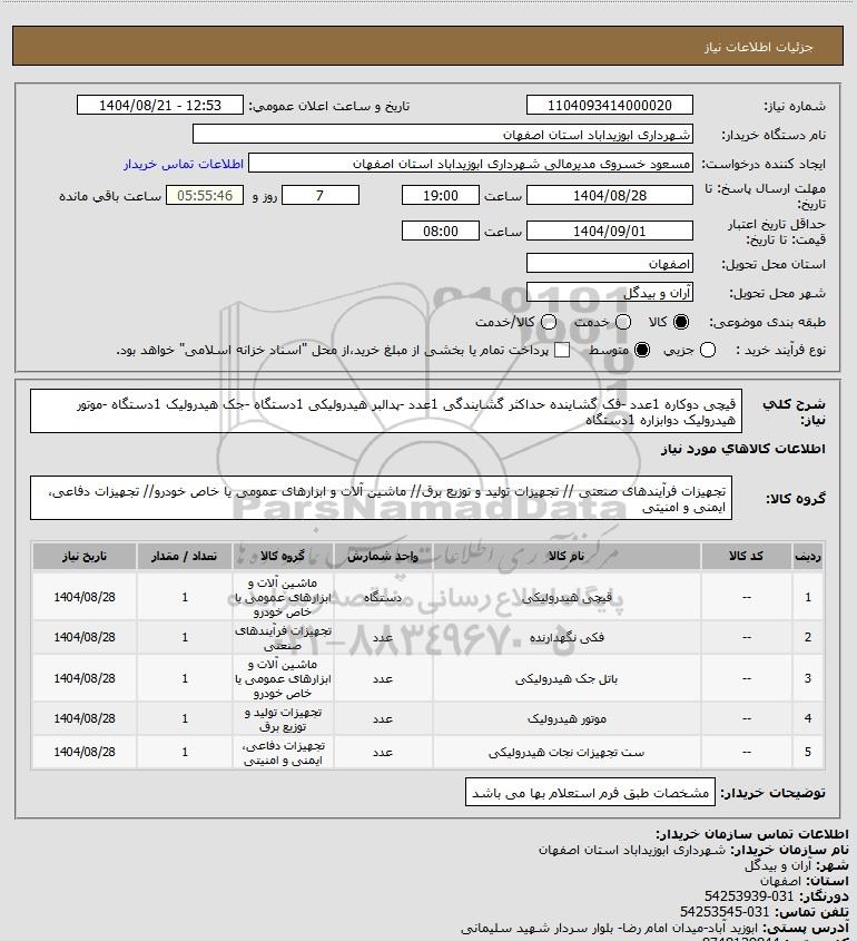 تلفن:5- 88349670 (021) فکس: 88349673 (021) Website: www.ParsNamadData.com E-mail: Info@ParsNamadData.com استعلام قیچی دوکاره 1عدد -فک گشاینده حداکثر گشایندگی 1عدد -پدالبر هیدرولیکی 1دستگاه -جک هیدرولیک 1دستگاه -موتور هیدرولیک دوابزاره 1دستگاه