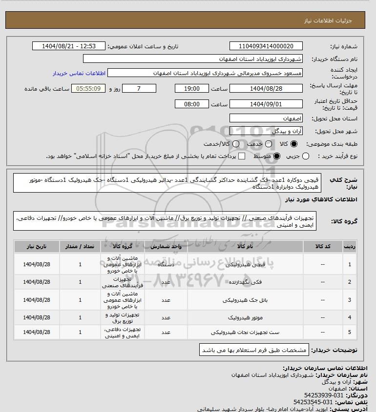 تلفن:5- 88349670 (021) فکس: 88349673 (021) Website: www.ParsNamadData.com E-mail: Info@ParsNamadData.com استعلام قیچی دوکاره 1عدد -فک گشاینده حداکثر گشایندگی 1عدد -پدالبر هیدرولیکی 1دستگاه -جک هیدرولیک 1دستگاه -موتور هیدرولیک دوابزاره 1دستگاه