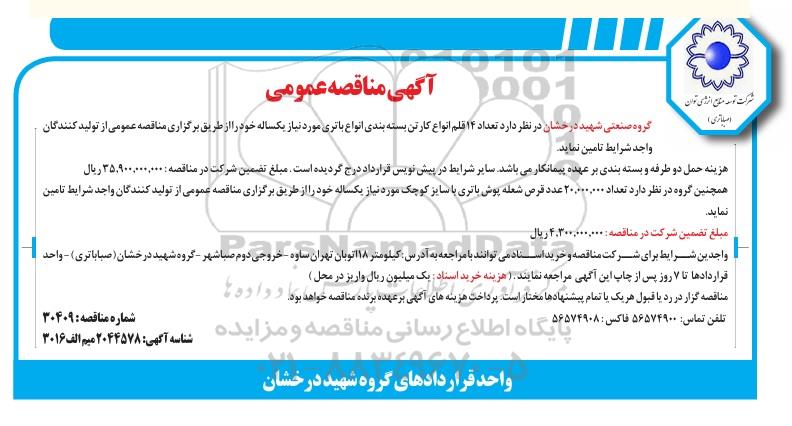 گروه صنعتی شهید درخشان در نظر دارد تعداد 14 قلم انواع کارتن بسته بندی انواع باتری مورد نیاز یکساله خود را از طریق برگزاری مناقصه عمومی و از تولید کنندگان واجد شرایط تامین نماید.
