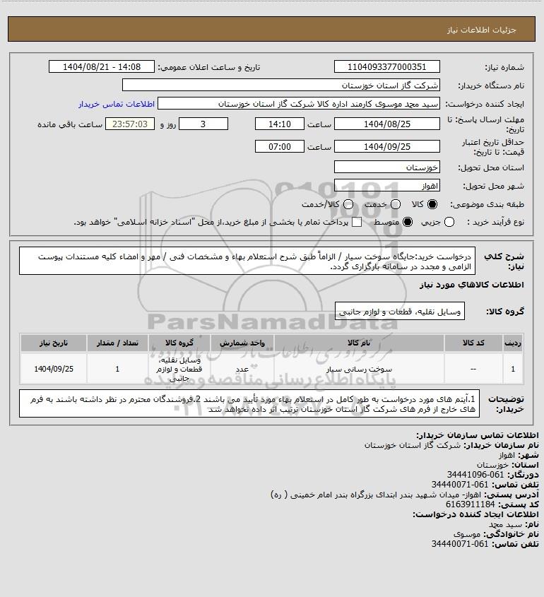 تلفن:5- 88349670 (021) فکس: 88349673 (021) Website: www.ParsNamadData.com E-mail: Info@ParsNamadData.com استعلام درخواست خرید:جایگاه سوخت سیار / الزاماً طبق شرح استعلام بهاء و مشخصات فنی / مهر و امضاء کلیه مستندات پیوست الزامی و مجدد در سامانه بارگزاری گردد.