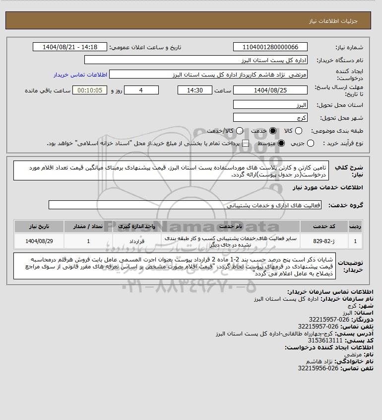 تلفن:5- 88349670 (021) فکس: 88349673 (021) Website: www.ParsNamadData.com E-mail: Info@ParsNamadData.com استعلام تامین کارتن و کارتن پلاست های مورداستفاده پست استان البرز.