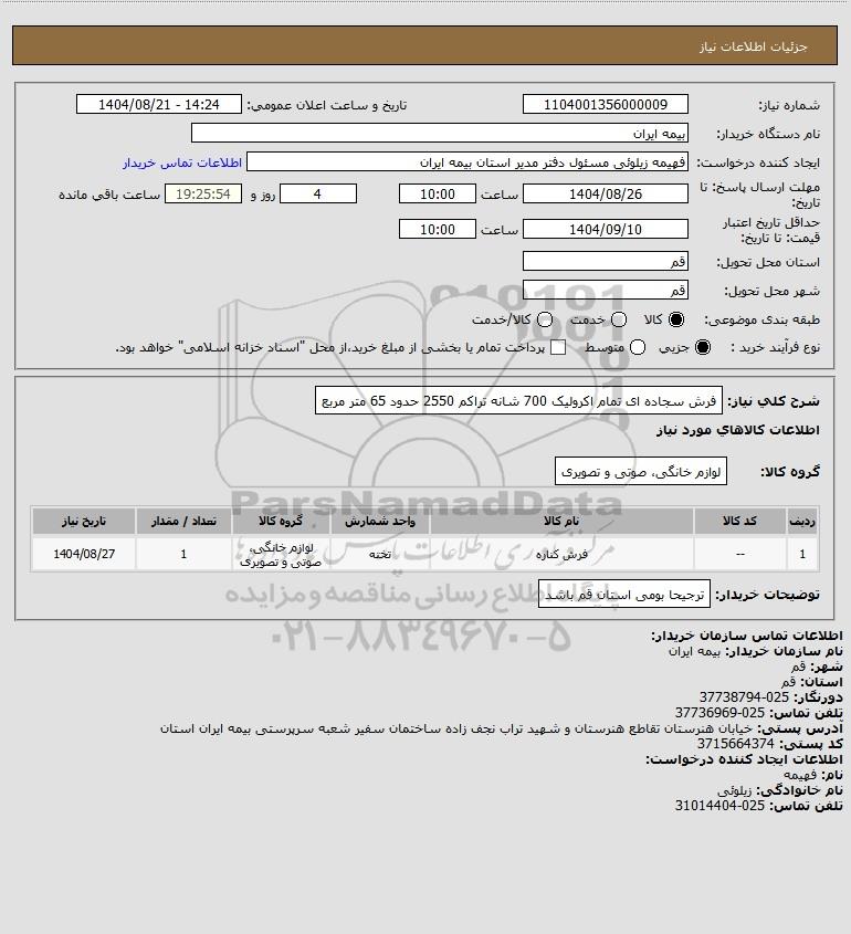 تلفن:5- 88349670 (021) فکس: 88349673 (021) Website: www.ParsNamadData.com E-mail: Info@ParsNamadData.com استعلام فرش سجاده ای تمام اکرولیک 700 شانه تراکم 2550 حدود 65 متر مربع