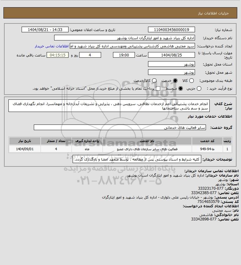 تلفن:5- 88349670 (021) فکس: 88349673 (021) Website: www.ParsNamadData.com E-mail: Info@ParsNamadData.com استعلام انجام خدمات پشتیبانی اعم ازخدمات نظافتی سرویس دهی پذیرایی و تشریفات آبدارخانه و مهمانسرا انجام نگهداری فضای سبز و سم پاشی ساختمانها