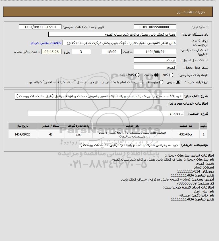 تلفن:5- 88349670 (021) فکس: 88349673 (021) Website: www.ParsNamadData.com E-mail: Info@ParsNamadData.com استعلام خرید 48 عدد سرچراغی همراه با نصب و راه اندازی تعمیر و تعویض دستک و هزینه جرثقیل (طبق مشخصات پیوست )