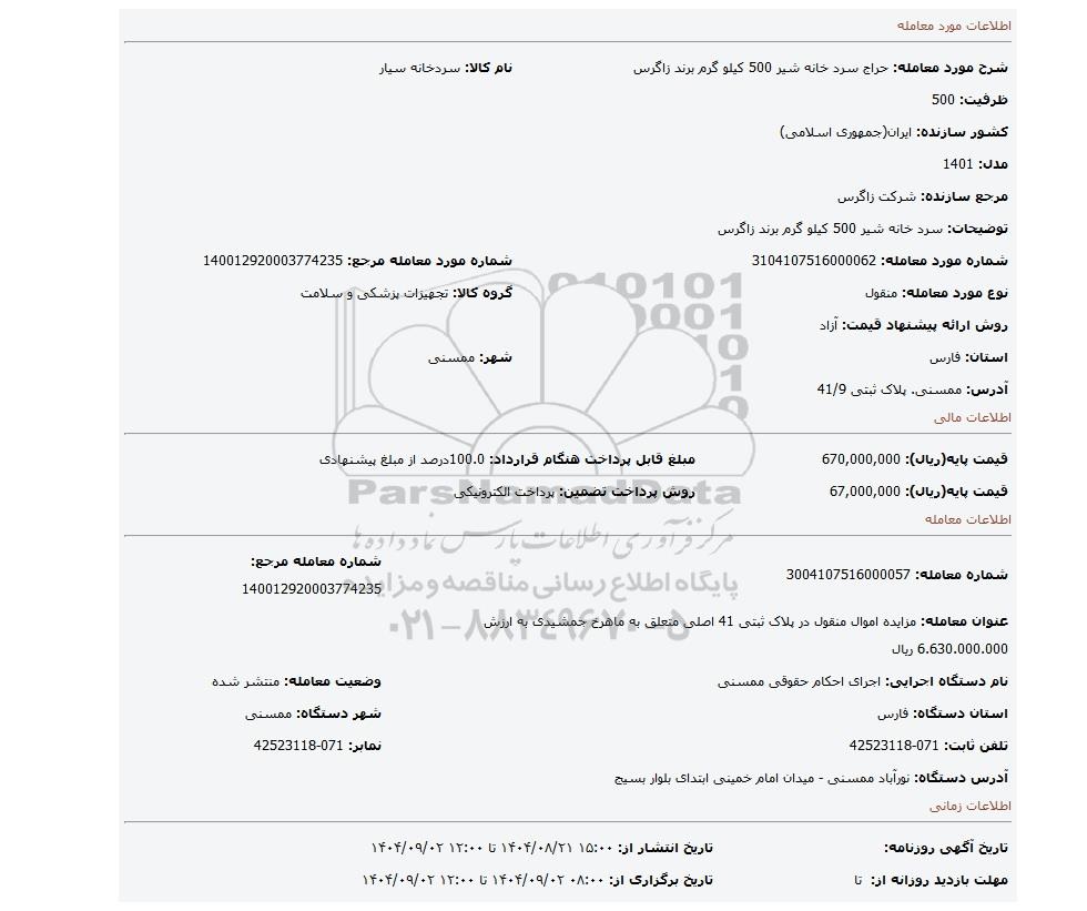 | عنوان آگهی: مزایده سرد خانه شیر 500 کیلو گرم برند زاگرس |