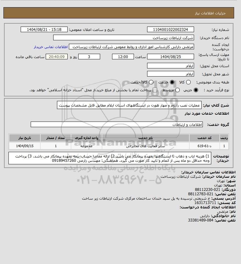 تلفن:5- 88349670 (021) فکس: 88349673 (021) Website: www.ParsNamadData.com E-mail: Info@ParsNamadData.com استعلام عملیات نصب رادوم و مهار هورن در ایستگاههای استان ایلام مطابق فایل مشخصات پیوست