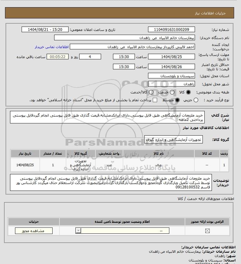 تلفن:5- 88349670 (021) فکس: 88349673 (021) Website: www.ParsNamadData.com E-mail: Info@ParsNamadData.com استعلام خرید ملزومات آزمایشگاهی طبق فایل پیوستی.دارای ایرانکدمشابه.قیمت گذاری طبق فایل پیوستی انجام گیردفایل پیوستی پرداختی 2ماهه