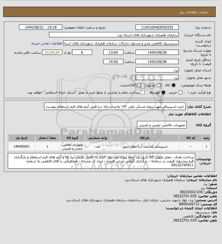 تلفن:5- 88349670 (021) فکس: 88349673 (021) Website: www.ParsNamadData.com E-mail: Info@ParsNamadData.com استعلام خرید اسپرینکلر جهت پروژه مسکن ملی ۱۹۲ واحدی دانه سا طبق آیتم های فرم استعلام پیوست