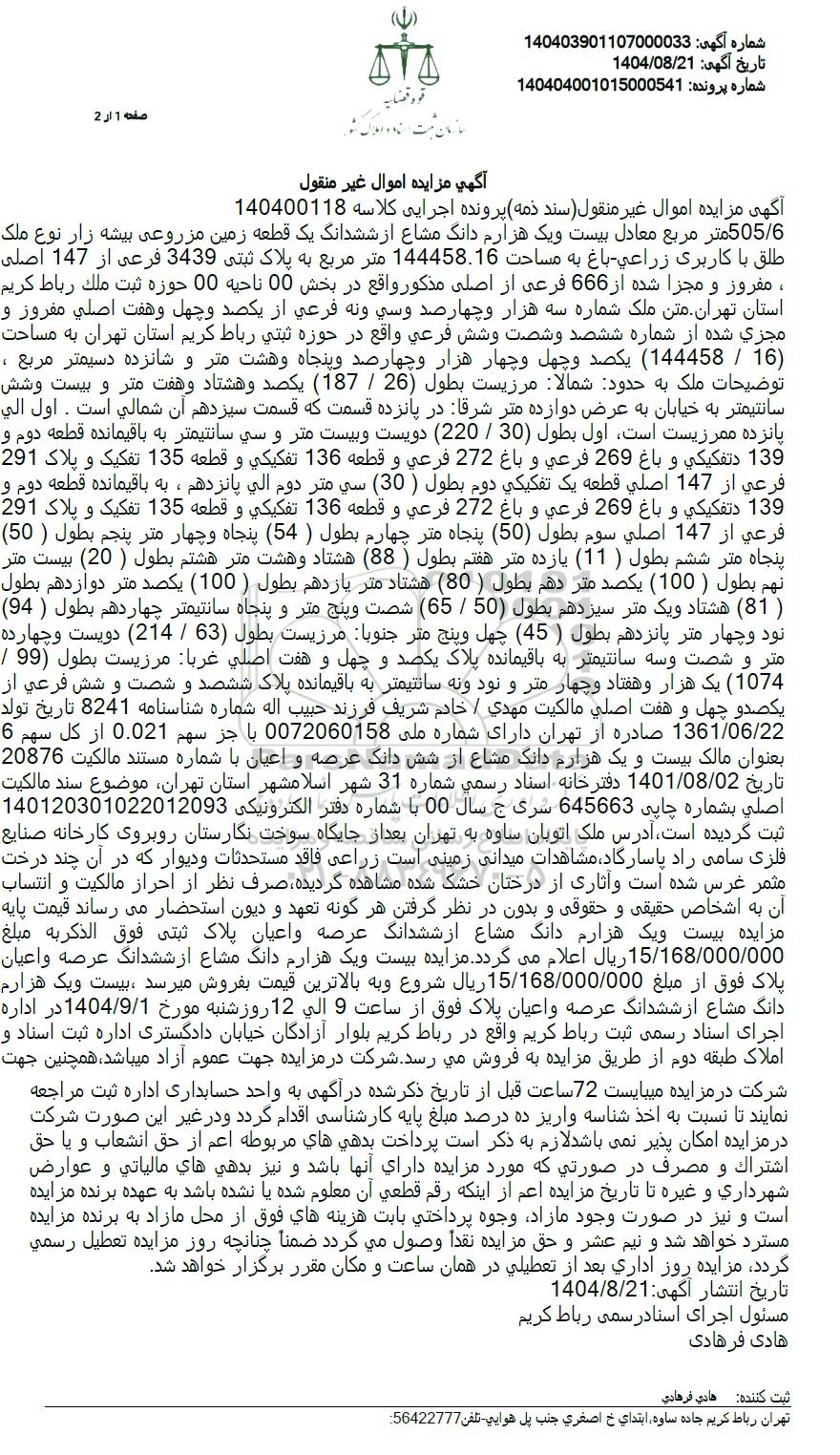 505.6 متر مربع معادل بیست و یک هزارم دانگ مشاع از ششدانگ یک قطعه زمین مزروعی بیشه زار نوع ملک طلق با کاربری زراعی باغ به مساحت 144458.16 متر مربع به پلاک ثبتی 3439 فرعی از 147 اصلی مفروز و مجزا شده از 666 فرعی از اصلی مذکور واقع در بخش 00 ناحیه 00 حوزه ثبت ملک رباط کریم استان تهران متن ملک شماره سه هزار و چهارصد وسی و نه فرعی از یکصد و چهل و هفت اصلی مفروز و مجزی شده از شماره ششصد و شصت و شش فرعی واقع در حوزه ثبتی رباط کریم استان تهران به مساحت (16 . 144458 یکصد و چهل و چهار هزار و چهارصد و پنجاه و هشت متر و شانزده دسیمتر مربع ، توضیحات ملک به حدود شمالا مرزیست بطول (26) . (187) یکصد و هشتاد و هفت متر و بیست وشش سانتیمتر به خیابان به عرض دوازده متر شرقا در پانزده قسمت که قسمت سیزدهم آن شمالی است . اول الی پانزده ممر زیست است، اول بطول (30) . (220) دویست و بیست متر و سی سانتیمتر به باقیمانده قطعه دوم و 139 دتفکیکی و باغ 269 فرعی و باغ 272 فرعی و قطعه 136 تفکیکی و قطعه 135 تفکیک و پلاک 291 فرعی از 147 اصلی قطعه یک تفکیکی دوم بطول (30) سی متر دوم الی پانزدهم ، به باقیمانده قطعه دوم و 139 دتفکیکی و باغ 269 فرعی و باغ 272 فرعی و قطعه 136 تفکیکی و قطعه 135 تفکیک و پلاک 291 فرعی از 147 اصلی سوم بطول (50) پنجاه متر چهارم بطول ( (54) پنجاه و چهار متر پنجم بطول (50) پنجاه متر ششم بطول (11) یازده متر هفتم بطول ( (88) هشتاد و هشت متر هشتم بطول (20) بیست متر نهم یطول ( 100 ) یکصد متر دهم بطول (80) هشتاد متر یازدهم بطول (100) یکصد متر دوازدهم بطول (81) هشتاد و یک متر سیزدهم بطول (50) . (65) شصت وپنج متر و پنجاه سانتیمتر چهاردهم بطول ( 94) نود و چهار متر پانزدهم بطول ( 45 چهل و پنج متر جنوبا مرزیست بطول (63) . 214) دویست و چهارده متر و شصت و سه سانتیمتر به باقیمانده پلاک یکصد و چهل و هفت اصلی غربا مرزیست بطول (99) .(1074) یک هزار و هفتاد و چهار متر و نود و نه سانتیمتر به باقیمانده پلاک ششصد و شصت و شش فرعی از یکصد و چهل و هفت اصلی مالکیت مهدی . خادم شریف فرزند حبیب اله شماره شناسنامه 8241 تاریخ تولد 1361.06.22 صادره از تهران دارای شماره ملی 0072060158 با جز سهم 0.021 از کل سهم 6 بعنوان مالک بیست و یک هزارم دانگ مشاع از شش دانگ عرصه و اعیان با شماره مستند مالکیت 20876 تاریخ 1401.08.02 دفترخانه اسناد رسمی شماره 31 شهر اسلامشهر استان تهران، موضوع سند مالکیت اصلی بشماره چاپی 645663 سری ج سال 00 با شماره دفتر الکترونیکی 140120301022012093 ثبت گردیده است آدرس ملک اتوبان ساوه به تهران بعد از جایگاه سوخت نگارستان روبروی کارخانه صنایع فلزی سامی راد پاسارگاد مشاهدات میدانی زمینی است زراعی فاقد مستحدثات و دیوار که در آن چند درخت مثمر غرس شده است و آثاری از درختان خشک شده مشاهده گردیده صرف نظر از احراز مالکیت و انتساب آن به اشخاص حقیقی و حقوقی و بدون در نظر گرفتن هر گونه تعهد و دیون استحضار می رساند قیمت پایه مزایده بیست و یک هزارم دانگ مشاع از ششدانگ از ششدانگ عرصه و اعیان اعیان پلاک ثبتى فوق الذکریه مبلغ 15.168.000.000 ریال اعلام می گردد. مزایده بیست و یک هزارم دانگ مشاع از ششدانگ عرصه و اعیان پلاک فوق از مبلغ 15.168.000.000 ریال شروع و به بالاترین قیمت بفروش میرسد ، بیست و یک هزارم دانگ مشاع از ششدانگ عرصه و اعیان پلاک فوق از ساعت 9 الی 12 روز شنبه مورخ 1404.9.1 در اداره اجرای اسناد رسمی ثبت رباط کریم واقع در رباط کریم بلوار آزادگان خیابان دادگستری اداره ثبت اسناد و املاک طبقه دوم از طریق مزایده به فروش می رسد. شرکت در مزایده جهت عموم آزاد میباشد، همچنین جهت شرکت در مزایده میبایست 72 ساعت قبل از تاریخ ذکر شده در آگهی به واحد حسابداری اداره ثبت مراجعه نمایند تا نسبت به اخذ شناسه واریز ده درصد مبلغ پایه کارشناسی اقدام گردد و در غیر این صورت شرکت در مزایده امکان پذیر نمی باشد لازم به ذکر است پرداخت بدهی های مربوطه اعم از حق انشعاب و یا حق اشتراک و مصرف در صورتی که مورد مزایده دارای آنها باشد و نیز بدهی های مالیاتی و عوارض شهرداری و غیره تا تاریخ مزایده اعم از اینکه رقم قطعی آن معلوم شده