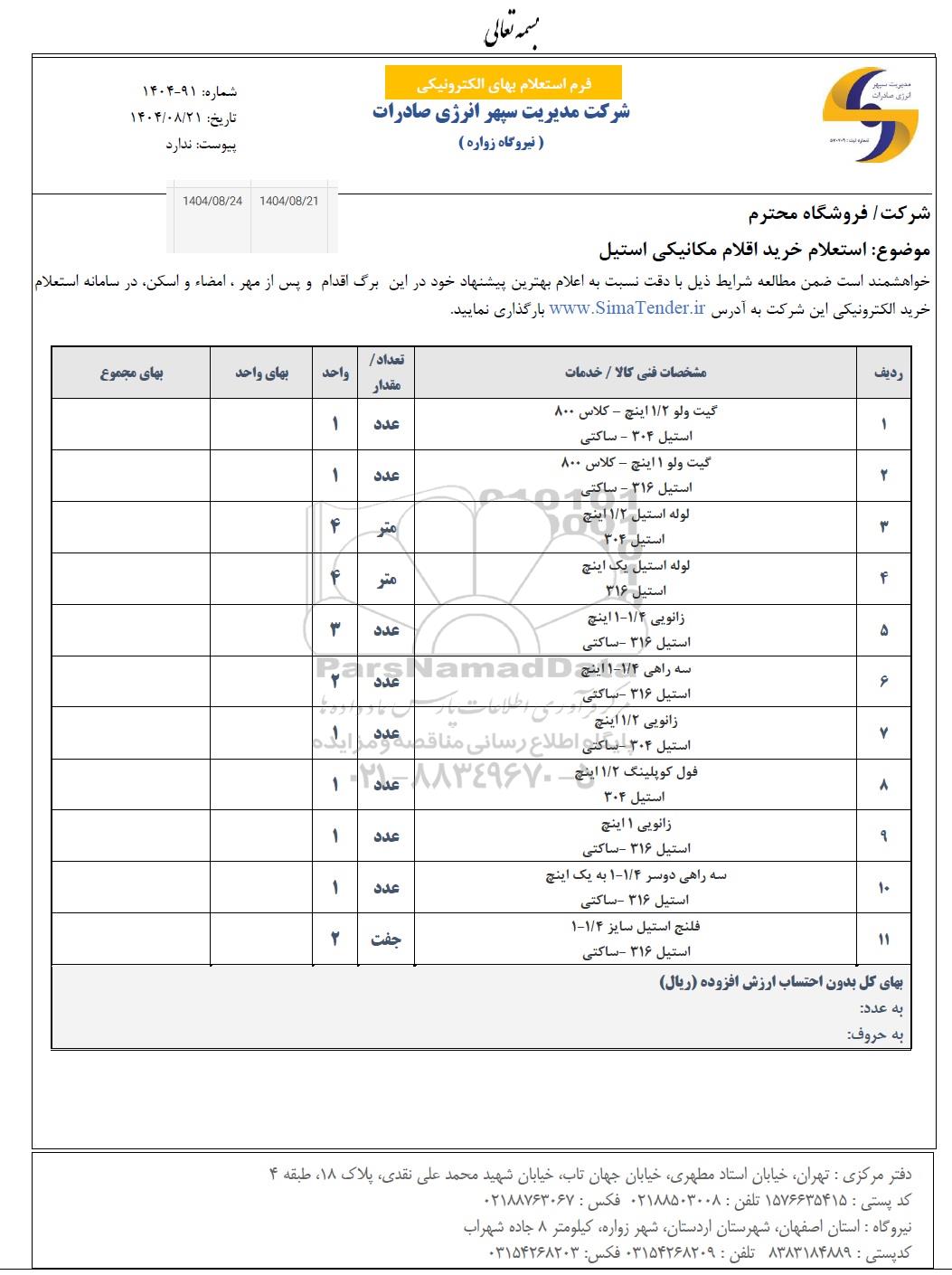 تلفن:5- 88349670 (021) فکس: 88349673 (021) Website: www.ParsNamadData.com E-mail: Info@ParsNamadData.com استعلام خرید اقلام مکانیکی استیل