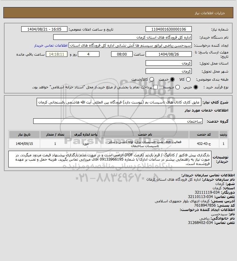 تلفن:5- 88349670 (021) فکس: 88349673 (021) Website: www.ParsNamadData.com E-mail: Info@ParsNamadData.com استعلام عایق کاری کانال های تاسیسات بم (پیوست دارد)