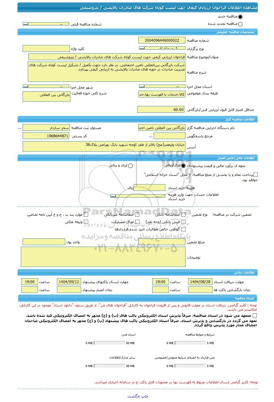 مشخصات مناقصه عمومی| شماره مناقصه | 2004096446000022 | | | | نوع برگزاری | یک مرحله ای | کلید واژه | | | عنوان/موضوع مناقصه | فراخوان ارزیابی کیفی جهت لیست کوتاه شرکت های صادرات پالایشی / پتروشیمی | | شرح مناقصه | شرکت بازرگانی بین المللی تامین اجتماعی، در نظر دارد جهت تکمیل / تشکیل لیست کوتاه شرکت های مدیریت صادرات در حوزه های صادرات پالایشی به ارزیابی کیفی بپردازد. | | استان محل اجرا | تهران | شهر محل اجرا | تهران | | طبقه بندی موضوعی | کالا،خدمات با فهرست بها،خدمات بدون فهرست بها | شرح کلی حوزه فعالیت | بازرگانی بین المللی | | حداقل امتیاز قابل قبول ارزیابی کیفی | | حداقل امتیاز قابل قبول ارزیابی فنی/بازرگانی | 60.00 | |