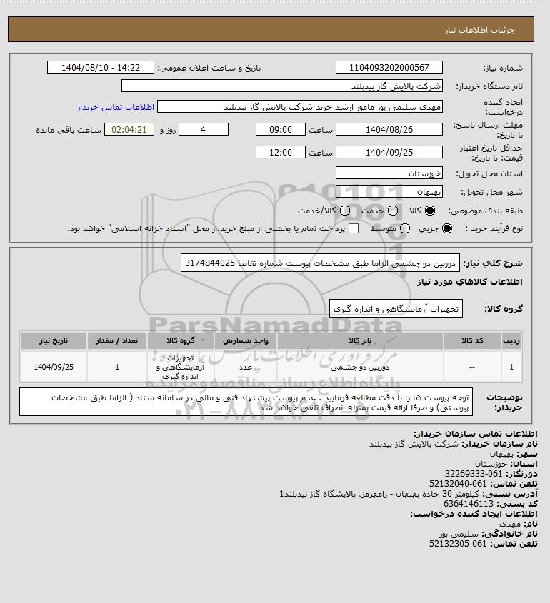 تلفن:5- 88349670 (021) فکس: 88349673 (021) Website: www.ParsNamadData.com E-mail: Info@ParsNamadData.com استعلام دوربین دو چشمی الزاما طبق مشخصات پیوست شماره تقاضا 3174844025