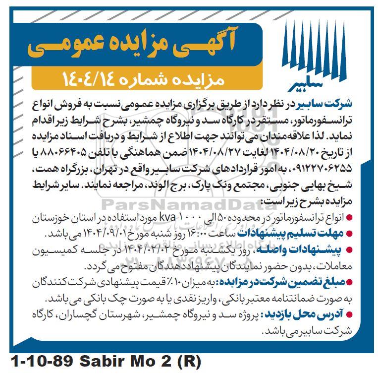 شرکت سابیر در نظر دارد از طریق برگزاری مزایده عمومی نسبت به فروش انواع ترانسفورماتور، مستقر در کارگاه سد و نیروگاه چمشیر، بشرح شرایط زیر اقدام نماید. لذا علاقه مندان می توانند جهت اطلاع از شرایط و دریافت اسناد مزایده از تاریخ 1404.08.20 لغایت 1404.08.27 ضمن هماهنگی با تلفن 88066405 یا 09122706255 ، به امور قراردادهای شرکت سابیر واقع در تهران ، بزرگراه همت ، شیخ بهایی جنوبی، مجتمع ونک پارک، برج الوند ، مراجعه نمایند. سایر شرایط مزایده بشرح زیر است