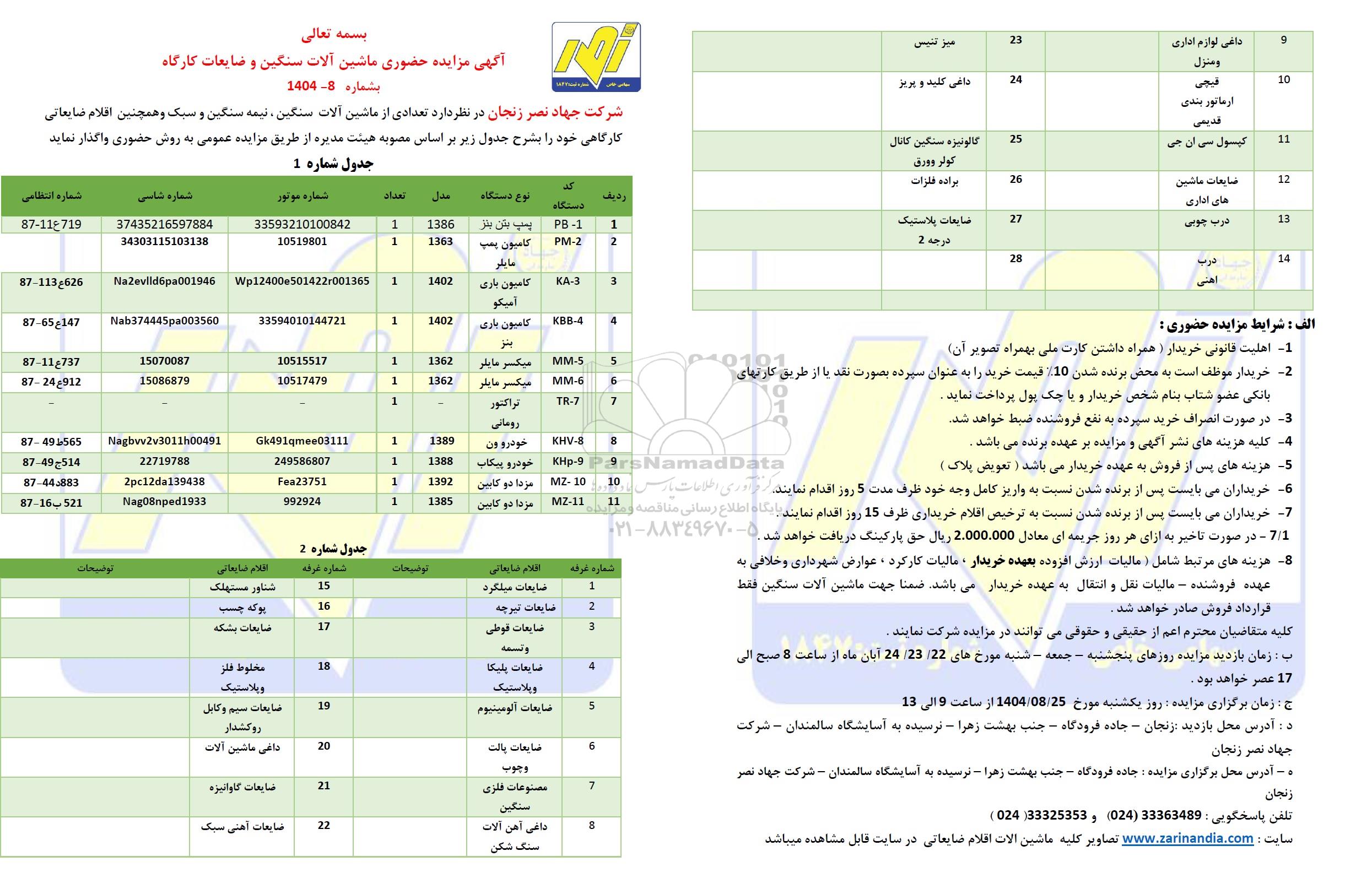 شرکت جهاد نصر زنجان در نظر دارد تعدادی از ماشین آلات سنگین، نیمه سنگین و سبک وهمچنین اقلام ضایعاتی کارگاهی خود را بشرح جدول زیر براساس مصوبه هیئت مدیره از طریق مزایده عمومی به روش حضوری واگذار نماید.