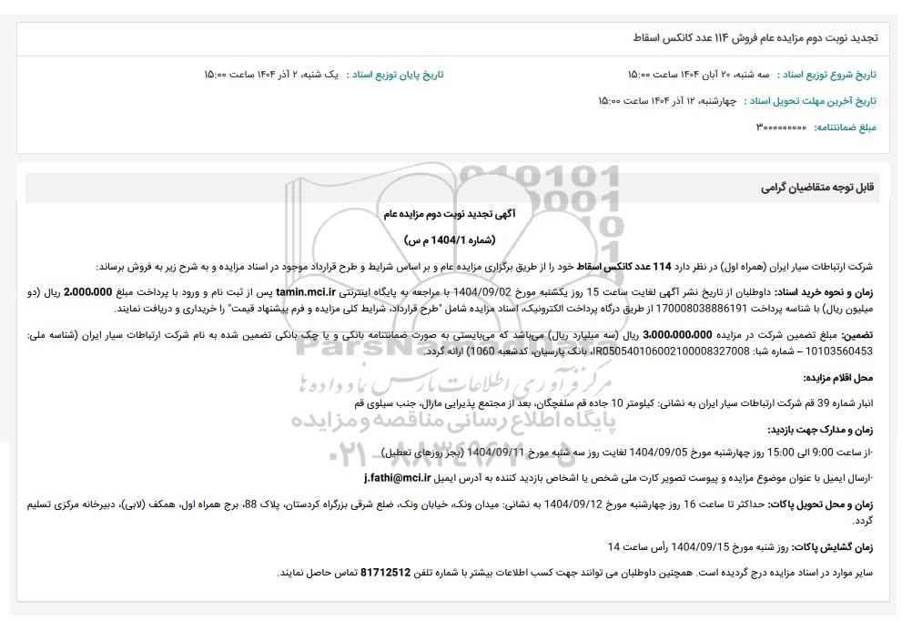 شرکت ارتباطات سیار ایران (همراه اول) در نظر دارد 114 عدد کانکس اسقاط خود را از طریق برگزاری مزایده عام و بر اساس شرایط و طرح قرارداد موجود در اسناد مزایده و به شرح زیر به فروش برساند:
