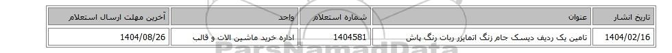 1404/02/16تامین یک ردیف دیسک جام زنگ اتمایزر ربات رنگ پاش1404581اداره خرید ماشین الات و قالب1404/08/26