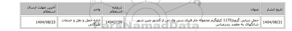 تلفن:5- 88349670 (021) فکس: 88349673 (021) Website: www.ParsNamadData.com E-mail: Info@ParsNamadData.com استعلام حمل دریایی گروپاژ1170 کیلوگرم محموله خار فنری سی وی تی از کشور چین شهر شانگهای به مقصد بندرعباس