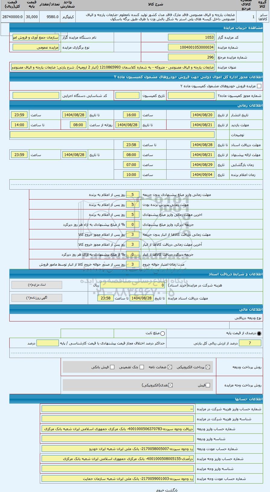 تلفن:5- 88349670 (021) فکس: 88349673 (021) Website: www.ParsNamadData.com E-mail: Info@ParsNamadData.com مزایده ضایعات پارچه و الیاف مصنوعی - متروکه - به شماره کلاسمان 1210865993 (انبار 2 ارومیه)
