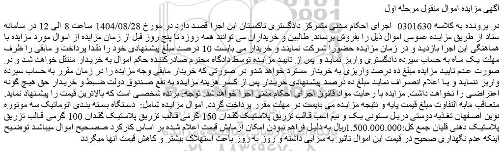 در پرونده به کلاسه 0301630 اجرای احکام مدنی متمرکز دادگستری تاکستان این اجرا قصد دارد در مورخ 1404/08/28 ساعت 8 الی 12 در سامانه ستاد از طریق مزایده عمومی اموال ذیل را بفروش برساند. طالبین و خریداران می توانند همه روزه تا پنج روز قبل از زمان مزایده از اموال مورد مزایده با هماهنگی این اجرا بازدید و در زمان مزایده حضورا شرکت نمایند و خریدار می بایست 10 درصد مبلغ پیشنهادی خود را نقدا پرداخت و مابقی را ظرف مهلت یک ماه به حساب سپرده دادگستری واریز نماید و پس از تایید مزایده توسط دادگاه محترم صادرکننده حکم اموال به خریدار منتقل خواهد شد و در صورت عدم تایید مزایده مبلغ ده درصد واریزی به خریدار مسترد خواهد شدو در صورتی که خریدار مابقی وجه مزایده را در زمان مقرر به حساب سپرده واریز ننماید و یا اعلام انصراف نماید مبلغ ده درصد پیشنهادی خریدار پس از کسر هزینه مزایده به نفع صندوق دولت ضبط و خریدار حق هیچ گونه اعتراضی را نخواهد داشت. مزایده با رعایت مواد قانون اجرای احکام مدنی اجرا خواهد شد. توجه: برنده شخصی است که بالاترین قیمت را پیشنهاد نماید. متعاقب مابه التفاوت مبلغ قیمت پایه و نتیجه مزایده می بایست در مهلت مقرر پرداخت گردد. اموال مزایده شامل: دستگاه بسته بندی اتوماتیک سه موتوره نوین اصفهان تغذیه دوستی دریل ستونی یک و نیم اسب قالب تزریق پلاستیک گلدان 150 گرمی قالب تزریق پلاستیک گلدان 100 گرمی قالب تزریق پلاستیک دهنی قلیان جمع کل:1.500.000.000﷼ به دلیل فراهم نبودن امکان آزمایش قیمت اعلام شده بر اساس کارکرد صصحیح اموال میباشد توضیح اینکه عدم نگهداری صحیح در قیمت این اموال تاثیر به سزایی داشته و روز به روز باعث استهلاک بیشتر و کاهش قیمت آنها میگردد