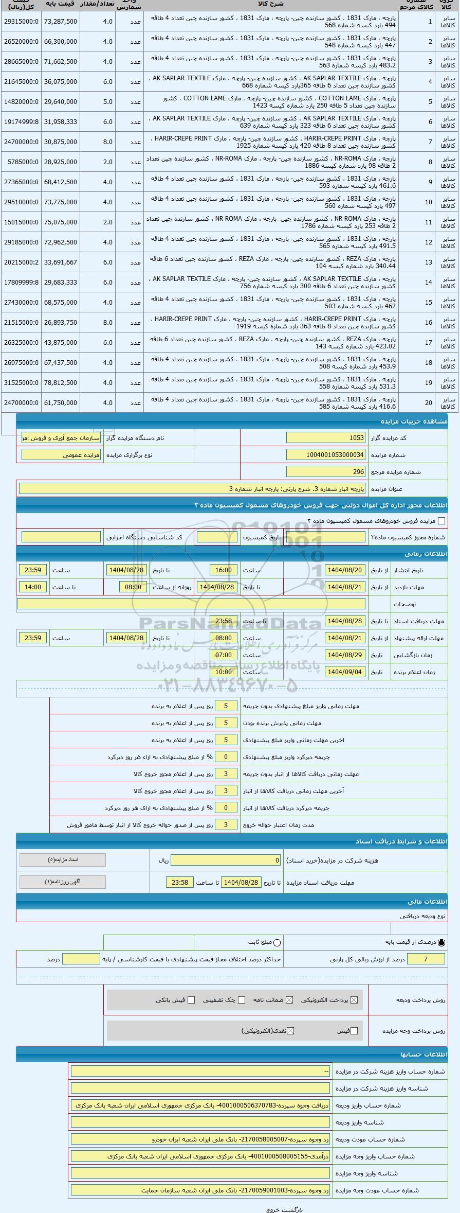 | سایر کالاها | 1 | پارچه ، مارک 1831 ، کشور سازنده چین- پارچه ، مارک 1831 ، کشور سازنده چین تعداد 4 طاقه 494 یارد کیسه شماره 568 | عدد | 4.0 | 73,287,500 | 29315000:0 | | سایر کالاها | 2 | پارچه ، مارک 1831 ، کشور سازنده چین- پارچه ، مارک 1831 ، کشور سازنده چین تعداد 4 طاقه 447 یارد کیسه شماره 548 | عدد | 4.0 | 66,300,000 | 26520000:0 | | سایر کالاها | 3 | پارچه ، مارک 1831 ، کشور سازنده چین- پارچه ، مارک 1831 ، کشور سازنده چین تعداد 4 طاقه 483.2 یارد کیسه شماره 563 | عدد | 4.0 | 71,662,500 | 28665000:0 | | سایر کالاها | 4 | پارچه ، مارک AK SAPLAR TEXTILE ، کشور سازنده چین- پارچه ، مارک AK SAPLAR TEXTILE ، کشور سازنده چین تعداد 6 طاقه 365یارد کیسه شماره 668 | عدد | 6.0 | 36,075,000 | 21645000:0 | | سایر کالاها | 5 | پارچه ، مارک COTTON LAME ، کشور سازنده چین- پارچه ، مارک COTTON LAME ، کشور سازنده چین تعداد 5 طاقه 250 یارد شماره کیسه 1423 | عدد | 5.0 | 29,640,000 | 14820000:0 | | سایر کالاها | 6 | پارچه ، مارک AK SAPLAR TEXTILE ، کشور سازنده چین- پارچه ، مارک AK SAPLAR TEXTILE ، کشور سازنده چین تعداد 6 طاقه 323 یارد کیسه شماره 639 | عدد | 6.0 | 31,958,333 | 19174999:8 | | سایر کالاها | 7 | پارچه ، مارک HARIR-CREPE PRINT ، کشور سازنده چین- پارچه ، مارک HARIR-CREPE PRINT ، کشور سازنده چین تعداد 8 طاقه 420 یارد کیسه شماره 1925 | عدد | 8.0 | 30,875,000 | 24700000:0 | | سایر کالاها | 8 | پارچه ، مارک NR-ROMA ، کشور سازنده چین- پارچه ، مارک NR-ROMA ، کشور سازنده چین تعداد 2 طاقه 98 یارد شماره کیسه 1886 | عدد | 2.0 | 28,925,000 | 5785000:0 | | سایر کالاها | 9 | پارچه ، مارک 1831 ، کشور سازنده چین- پارچه ، مارک 1831 ، کشور سازنده چین تعداد 4 طاقه 461.6 یارد کیسه شماره 593 | عدد | 4.0 | 68,412,500 | 27365000:0 | | سایر کالاها | 10 | پارچه ، مارک 1831 ، کشور سازنده چین- پارچه ، مارک 1831 ، کشور سازنده چین تعداد 4 طاقه 497 یارد کیسه شماره 560 | عدد | 4.0 | 73,775,000 | 29510000:0 | | سایر کالاها | 11 | پارچه ، مارک NR-ROMA ، کشور سازنده چین- پارچه ، مارک NR-ROMA ، کشور سازنده چین تعداد 2 طاقه 253 یارد کیسه شماره 1786 | عدد | 2.0 | 75,075,000 | 15015000:0 | | سایر کالاها | 12 | پارچه ، مارک 1831 ، کشور سازنده چین- پارچه ، مارک 1831 ، کشور سازنده چین تعداد 4 طاقه 491.5 یارد کیسه شماره 565 | عدد | 4.0 | 72,962,500 | 29185000:0 | | سایر کالاها | 13 | پارچه ، مارک REZA ، کشور سازنده چین- پارچه ، مارک REZA ، کشور سازنده چین تعداد 6 طاقه 340.44 یارد شماره کیسه 104 | عدد | 6.0 | 33,691,667 | 20215000:2 | | سایر کالاها | 14 | پارچه ، مارک AK SAPLAR TEXTILE ، کشور سازنده چین- پارچه ، مارک AK SAPLAR TEXTILE ، کشور سازنده چین تعداد 6 طاقه 300 یارد کیسه شماره 756 | عدد | 6.0 | 29,683,333 | 17809999:8 | | سایر کالاها | 15 | پارچه ، مارک 1831 ، کشور سازنده چین- پارچه ، مارک 1831 ، کشور سازنده چین تعداد 4 طاقه 462 یارد کیسه شماره 503 | عدد | 4.0 | 68,575,000 | 27430000:0 | | سایر کالاها | 16 | پارچه ، مارک HARIR-CREPE PRINT ، کشور سازنده چین- پارچه ، مارک HARIR-CREPE PRINT ، کشور سازنده چین تعداد 8 طاقه 363 یارد شماره کیسه 1919 | عدد | 8.0 | 26,893,750 | 21515000:0 | | سایر کالاها | 17 | پارچه ، مارک REZA ، کشور سازنده چین- پارچه ، مارک REZA ، کشور سازنده چین تعداد 6 طاقه 423.02 یارد شماره کیسه 143 | عدد | 6.0 | 43,875,000 | 26325000:0 | | سایر کالاها | 18 | پارچه ، مارک 1831 ، کشور سازنده چین- پارچه ، مارک 1831 ، کشور سازنده چین تعداد 4 طاقه 453.9 یارد شماره کیسه 508 | عدد | 4.0 | 67,437,500 | 26975000:0 | | سایر کالاها | 19 | پارچه ، مارک 1831 ، کشور سازنده چین- پارچه ، مارک 1831 ، کشور سازنده چین تعداد 4 طاقه 531.3 یارد کیسه شماره 558 | عدد | 4.0 | 78,812,500 | 31525000:0 | | سایر کالاها | 20 | پارچه ، مارک 1831 ، کشور سازنده چین- پارچه ، مارک 1831 ، کشور سازنده چین تعداد 4 طاقه 416.6 یارد کیسه شماره 585 | عدد | 4.0 | 61,750,000 | 24700000:0 |